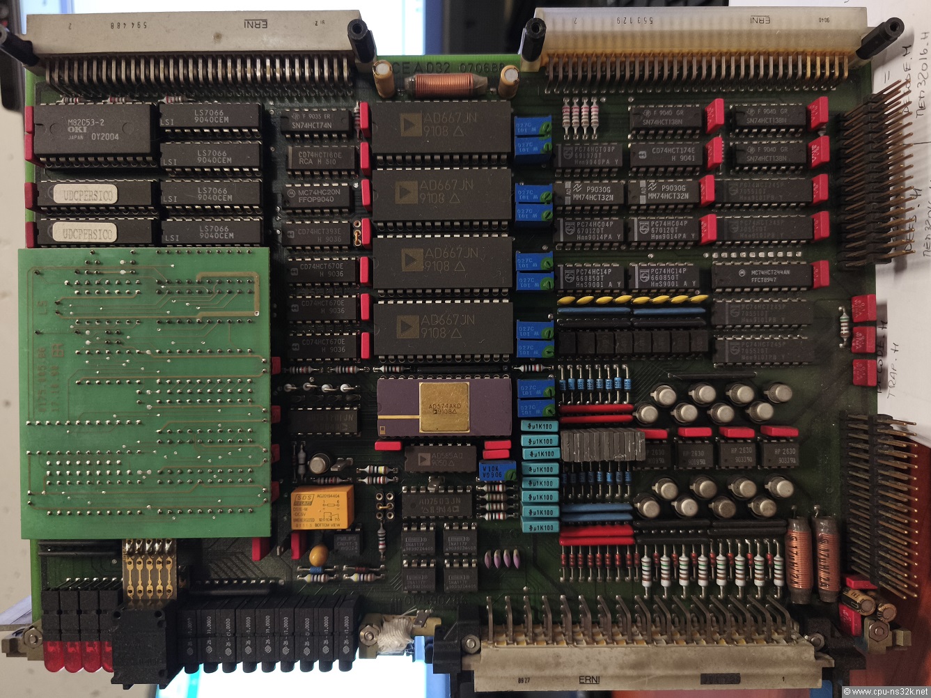 The board shown in Figure 5 is different from my one. First inside the socket for the NS32202 ICU is an IC in a ceramic package. It could be the original ICU from the 80's. But the lid is too big. The second difference is an add-on board placed in the socket for the NS32081 FPU. The chip on the board should be the faster FPU NS32181.