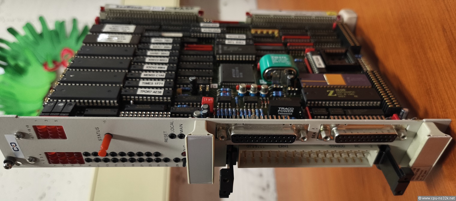 The board uses the NS32CG16 embedded CPU. Additional processing power comes from the FPU NS32081. The available memory is 320 kBytes of SRAM and 256 kBytes of EPROM. This is a lot and leds to the assumption that the board is able to work on itself. Maybe only simple messages were given to a higher level control computer.