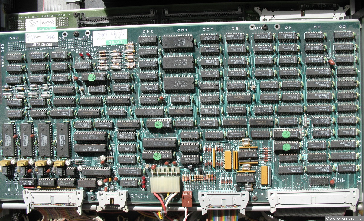 Fig. 2. The CPU board of the 1401plus is an unusual view: all devices use black plastic packages - even the NS32GX32A CPU!